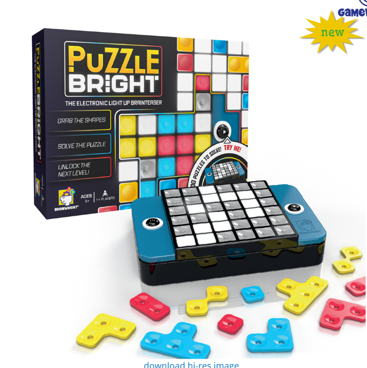 Puzzle Bright is an electronic light up brainteaser with over 300 puzzles to solve. The colored LED lights indicate which colored pieces you’ll need to solve the puzzle. Then, a unique shape is displayed on the screen. Use the pieces and cover the lights! Make sure no like colors are touching - there is only 1 correct solution for each puzzle. Challenge your mind with 300 puzzles in varying difficulty levels!