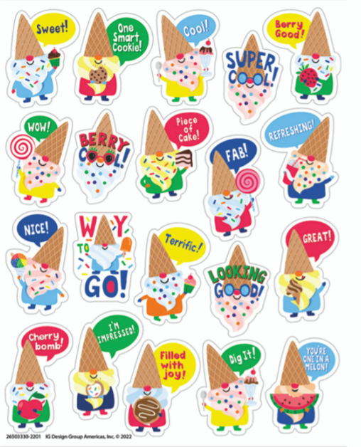 There's gnome doubt about it - everyone loves dessert! These fun and colorful candy scented stickers are sure to be a favorite among students, teachers, and parents! Features fun sticker poses of sweet gnomes, each with a long-lasting smell. Add to graded assignments, classroom crafts, letters, party invites, cards, rewards, and more!