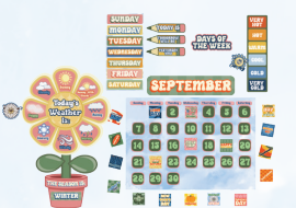 What's Included - 100 Piece Set Includes 5 Panels with 1 giant calendar grid, 12-month headers, 33 dates, 37 special days, a days of the week header and chart with 3 indicators, 2 character indicators, and a 10-piece season and weather set.