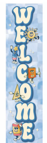 Welcome students, parents and other visitors with this large banner. Features large letters and school tools on a blue checkered background. Printed on heavyweight card stock, vertical banner measures 45" tall and 12" wide.