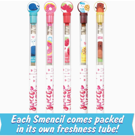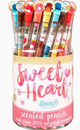 The Sweetheart Smencils® are our gourmet scented pencils . Each Sweetheart Smencil® is a No.2 graphite pencil and is packaged in its own recyclable plastic freshness tube that includes a collectible character top cap!
