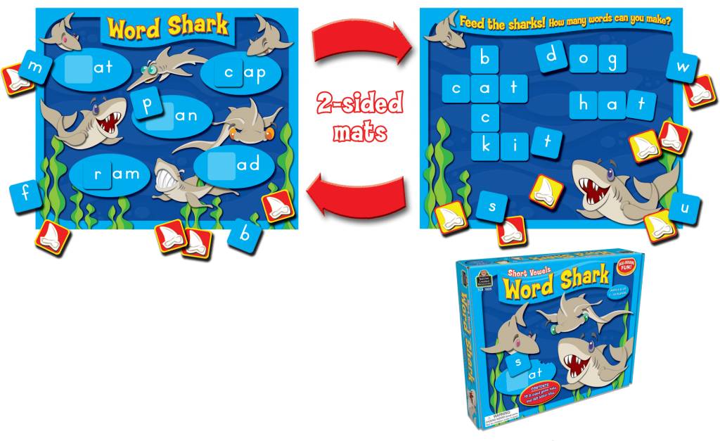 The fun begins when each player chooses a Word Shark mat. Player 1 draws a consonant tile from the pile and tries to add it to a word ending on his or her mat to make a word. If the letter cannot be used to spell a word, it is returned to the pile. Then the next player draws a tile and tries to make a word. The first player to fill a mat with words wins!