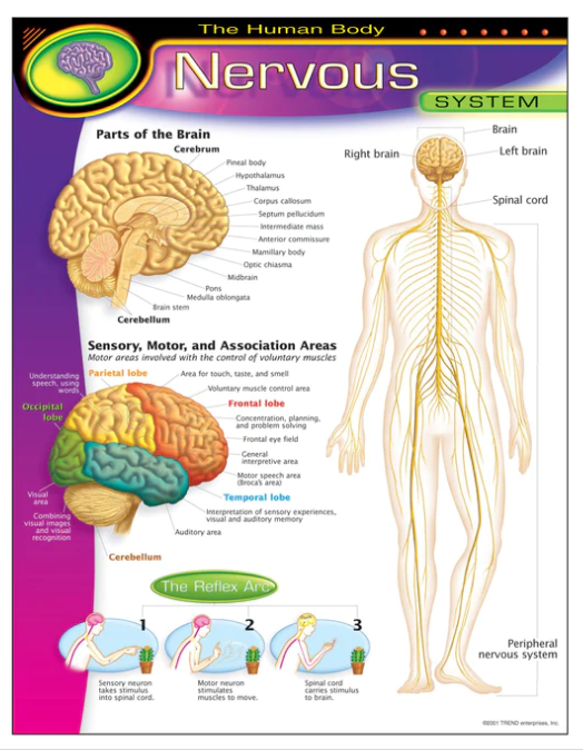 Learn about the human body's nervous system with illustrations and labels. Two inset drawings provide technical terms for parts of the brain and show which human activities are controlled by each part. Rich content engages viewers and aligns with Learning Standards.