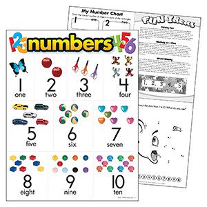 Numerals and number words are illustrated with colorful photographs of objects to count. Durable. Extra Value: Reproducibles on back. 17" x 22".