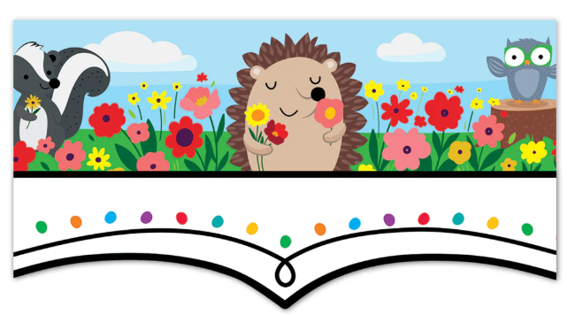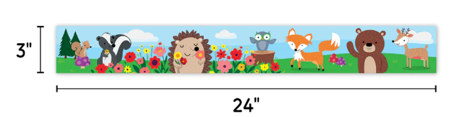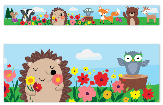 BEAUTIFUL NATURE SCENE – The calming colors of green grass and blue sky provide the backdrop for this border’s scene, which includes colorful flowers and charming woodland animals.