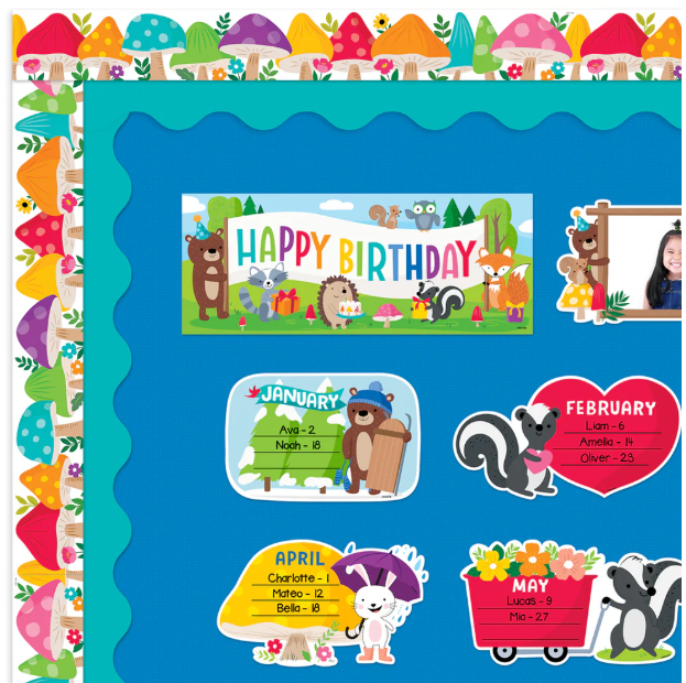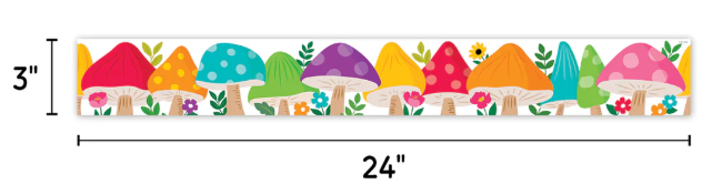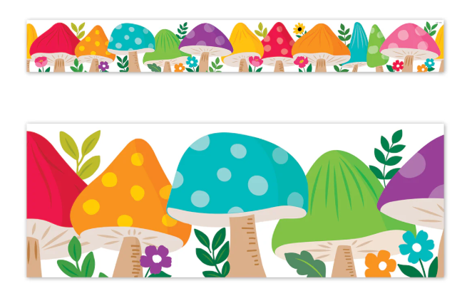 The big, colorful mushrooms on this Woodland Friends Jumbo Mushrooms EZ Border will brighten any space and add a touch of whimsy. Perfect for use on bulletin boards in a wide variety of classroom, office, and school settings.